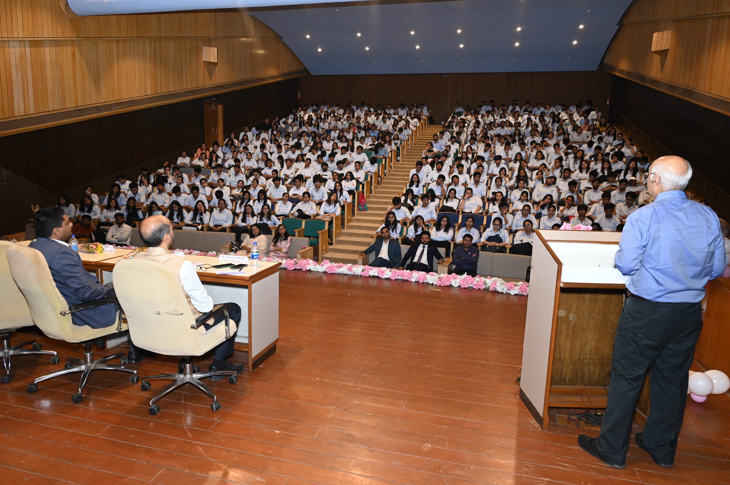Dr. Anup K. Singh, Director General of Nirma University, presided over the function and delivered a thoughtful and motivating address to the gathering. He began by commending the Institute of Commerce, Nirma University (ICNU), for its remarkable accomplishments and consistent efforts in fostering academic and professional excellence. In his address, Dr. Singh talked about the well-known marshmallow experiment to illustrate the importance of patience, perseverance, and delayed gratification in achieving long-term success. He urged students to remain focused on their goals, emphasizing that true excellence is built over time through consistent hard work, discipline, and resilience. His words served as an inspiring reminder that sustained commitment and a long-term vision are key to unlocking one’s fullest potential.